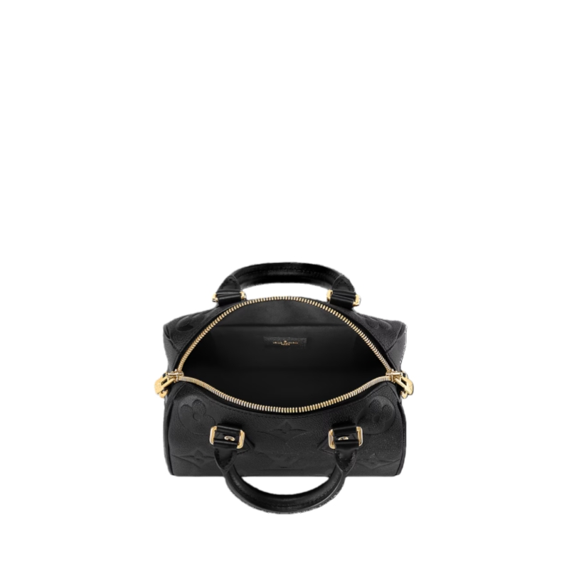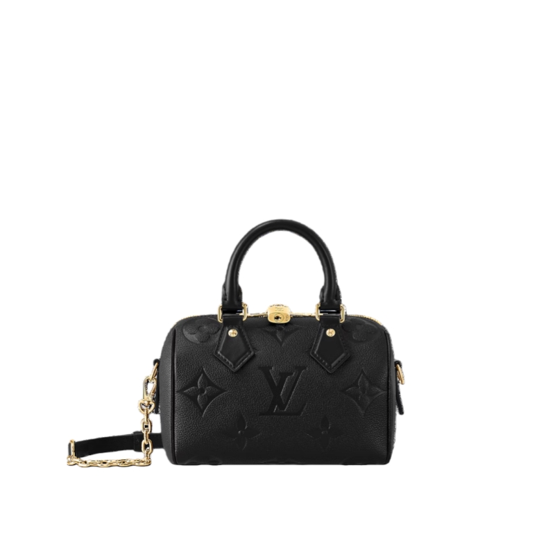 The Speedy Bandoulière 20 is an on-trend compact handbag, just the right size to carry daily essentials. It’s made from smooth grained Monogram Empreinte leather, embossed with an Oversized Monogram pattern. The hardware and padlock are a golden color. It has a delicate chain strap – removeable and adjustable – in addition to two Toron handles.