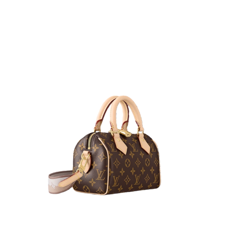 The Speedy Bandoulière 20 hand bag takes on classic Louis Vuitton allure in Monogram canvas with natural cowhide-leather trim and gold-color hardware. Inspired by the House’s emblematic travel bag, its distinctive shape is adorned with two rolled-leather top handles, padlock. A detachable two-color strap, signed Louis Vuitton, enables shoulder and cross-body wear.