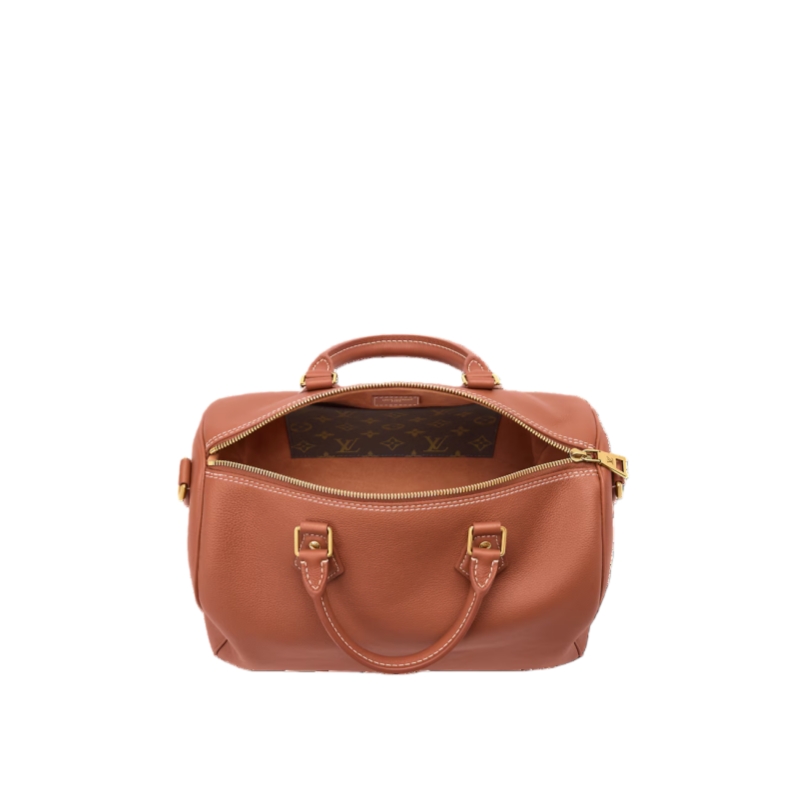 The perfect travel companion, this Low Key edition of the Speedy Soft 30 is crafted from supple calf leather in a timeless shade. Adorned with a signature LV padlock in a aged gold-toned finish, this sleek design comes with a removable strap for multiple carry options. It is sized to fit everyday essentials and includes a flat pocket on the inside.