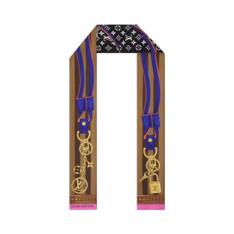 The bold design of the Strap And Trunk bandeau was inspired by the look of historic Monogram luggage from the 19th century. Printed on pure silk, it features a trunk-style leather strap plus a chain adorned with emblematic Louis Vuitton charms. An elegant, eye-catching accessory, and a tribute to the House’s heritage in the art of travel.