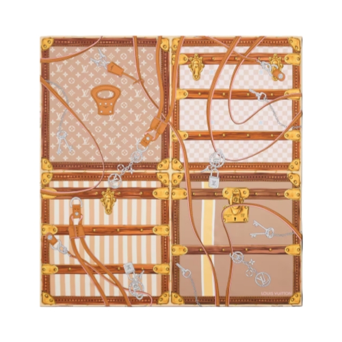 The artistic design of the Strap And Trunk square was inspired by classic creations from the House’s archives. Printed on fine silk, it depicts four historic canvas-covered trunks adorned with signature motifs like the Monogram and Damier patterns, overlaid with leather straps and padlocks. A stylish, versatile accessory and an elegant ode to the spirit of travel.
