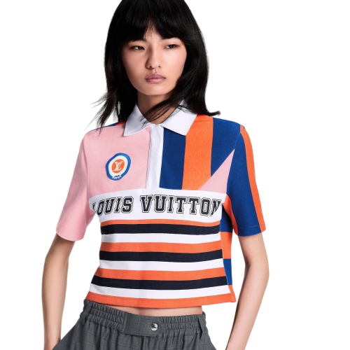 This cropped polo top has a fresh, graphic feel in soft cotton jersey featuring an array of chunky horizontal and vertical stripes in a playful palette. A large Louis Vuitton print and a colorful LV Initials patch sign the front, while a flat collar and hidden button tab underscore the classic sporty style.