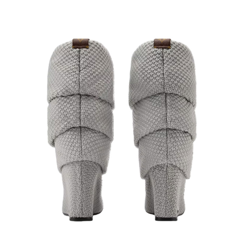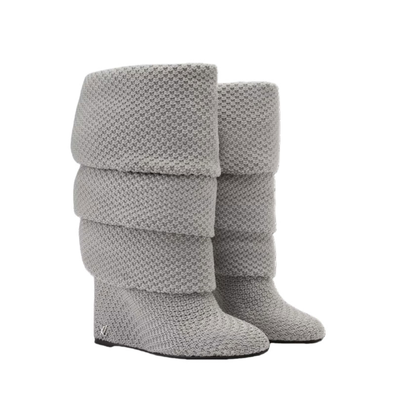The Summer mid wedge boot was seen on the runway at the Louis Vuitton Fall-Winter 2025 women's show. Crafted from specially developed bouclé knit, this model was inspired by the disco period. Its elegantly slouchy silhouette is accentuated by its high wedge heel, which is signed with an LV Initials stud.
