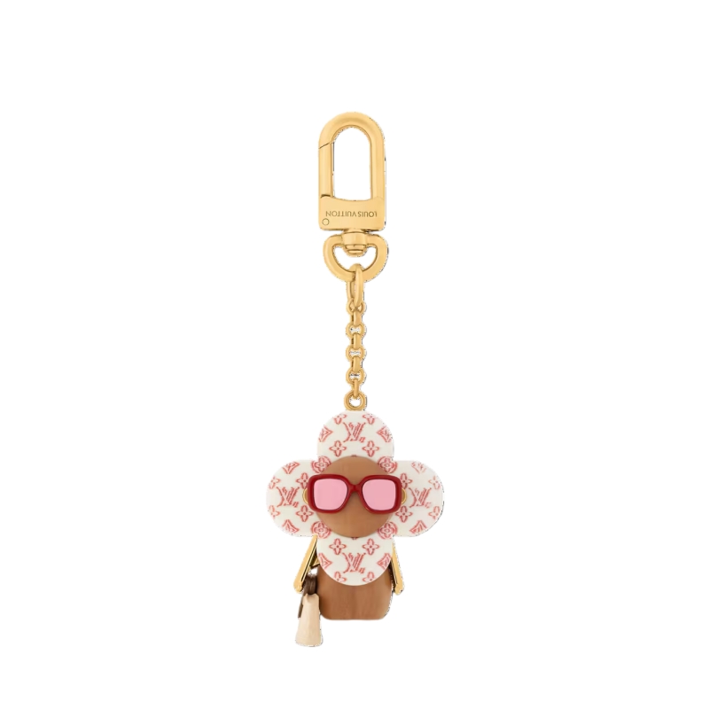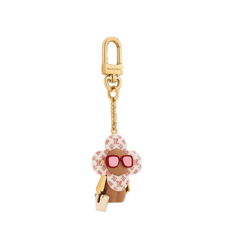 The House’s famous Monogram-inspired mascot is ready for sunny weather with the Summer Vivienne bag charm. Crafted in gold-toned metal and wood, Vivienne captures the spirit of the season with oversized sunglasses and a raffia-style bag. A unique accessory, perfect for adding a colorful accent to a key holder or favorite handbag.