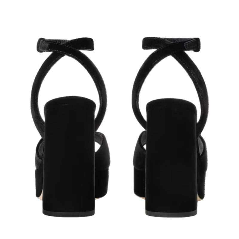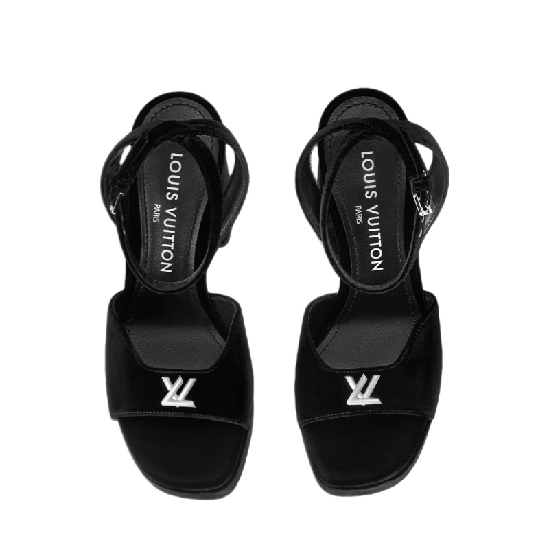 The Swing platform sandal is a sophisticated, evening-ready style in soft velvet. The smooth texture of the velvet contrasts with shiny, silver-toned metal of the LV Initials accessory on the rounded front strap, and the small buckle on the adjustable ankle strap. This model's high, V-shaped block heel features a contrasting metallic interior.