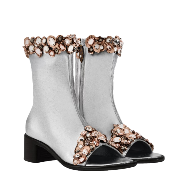 Referencing a statement look of the Cruise 2026 fashion show, the Talisman open-toe ankle boot is crafted from metallic lambskin embellished with glittering stones inspired by Byzantine and medieval adornments. This striking model comes on a low block heel and features a side zip for easy fitting.