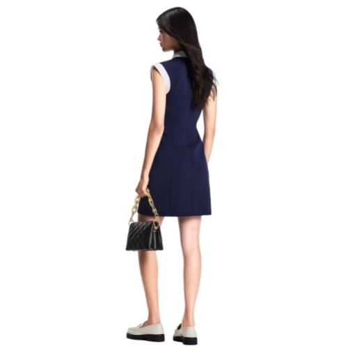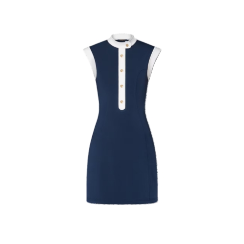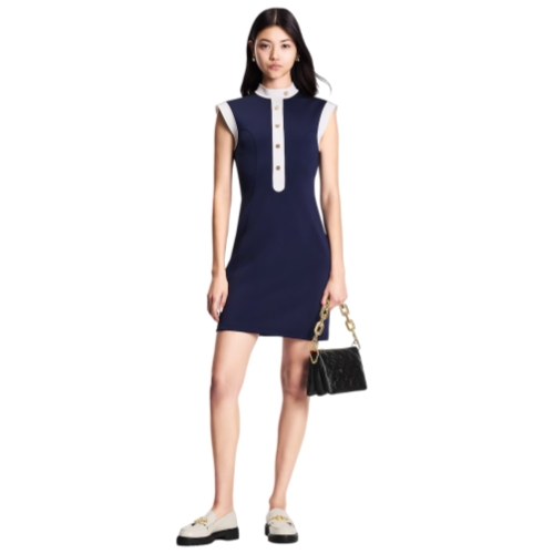 This dress is sleek and sporty in smooth, form-fitting technical jersey detailed with princess seams that accentuate a feminine silhouette. Color-blocking highlights the standing collar, cap sleeves and snap-button tab for a graphic look that nods to sailor styles. The top snap button is discreetly detailed with an anchor motif from the Nautical collection.