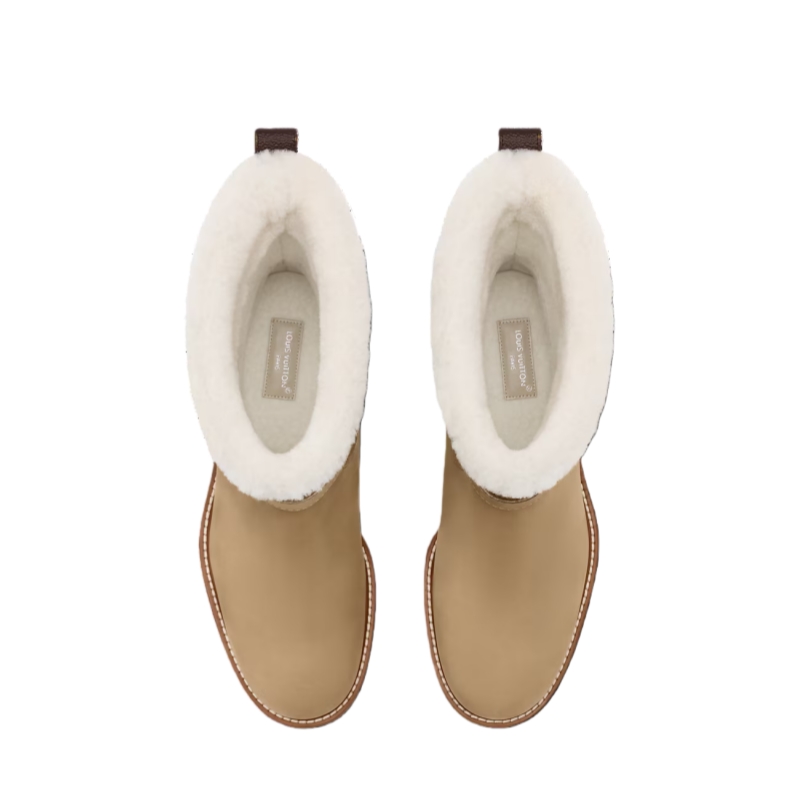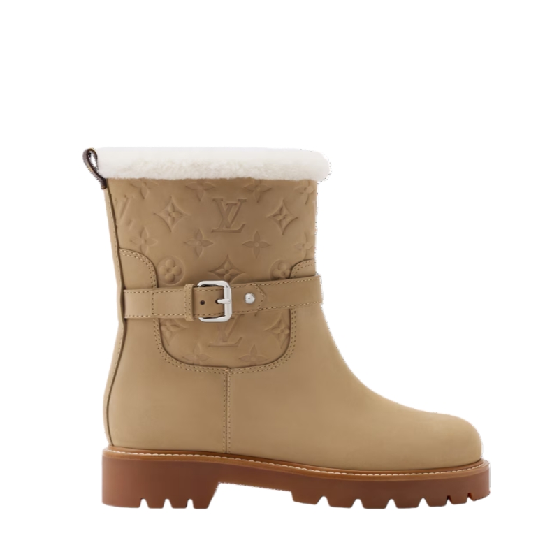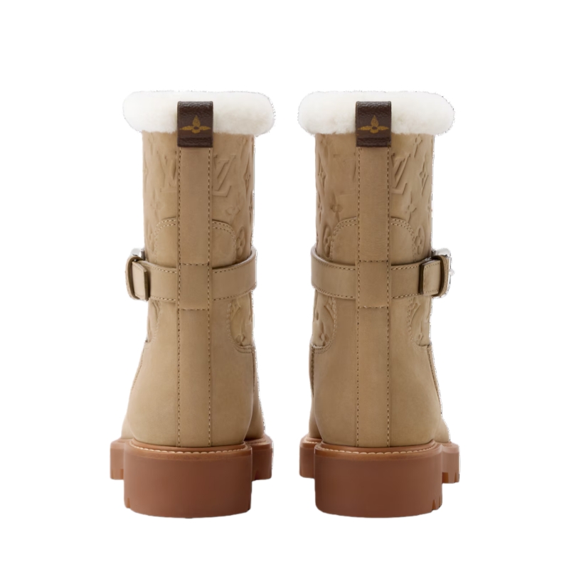 The Territory flat ankle boot is crafted from nubuck calf leather, which is partially debossed with the Monogram pattern. This model has a snug shearling lining, which is visible as trim around the top of the boot, and a decorative, belt-like strap with a silver-toned buckle and studs. It is finished with a sturdy rubber outsole.
