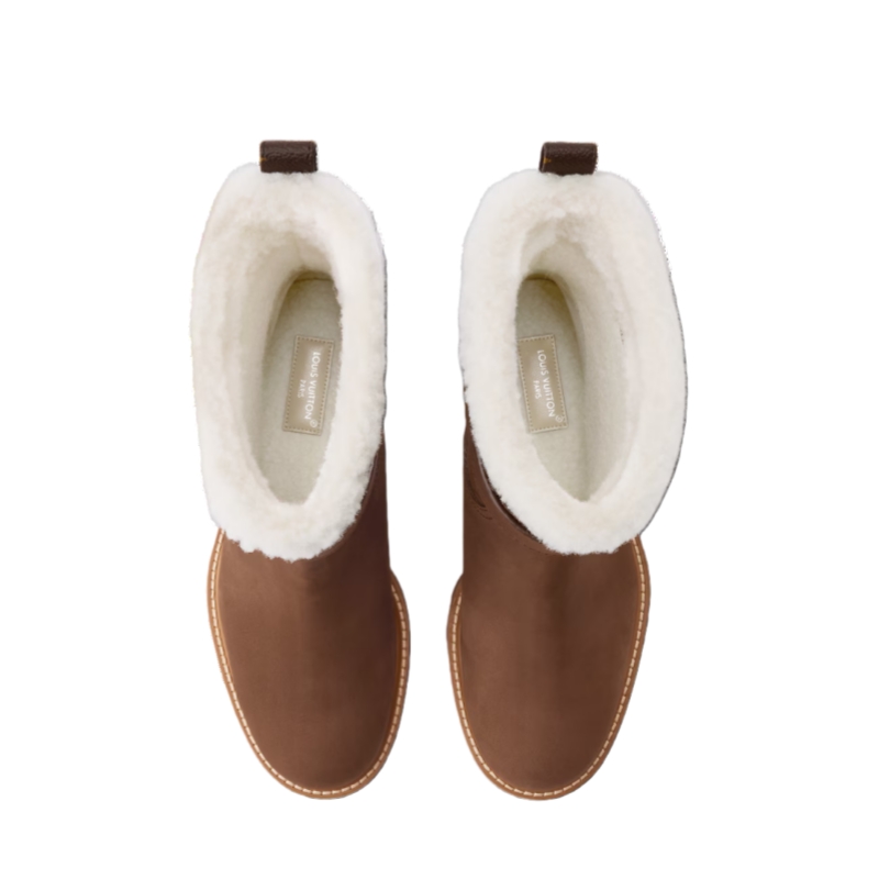 The Territory flat ankle boot is crafted from nubuck calf leather, which is partially debossed with the Monogram pattern. This model has a snug shearling lining, which is visible as trim around the top of the boot, and a decorative, belt-like strap with a silver-toned buckle and studs. It is finished with a sturdy rubber outsole.