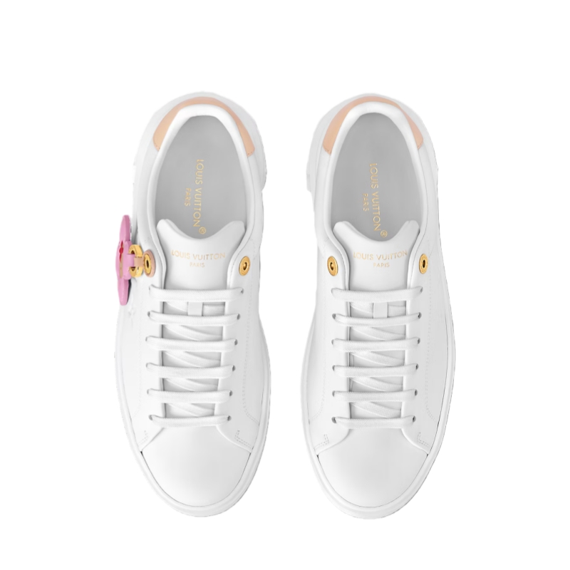 This refined interpretation of the Time Out sneaker comes in soft calf leather, which is discreetly embossed with the LV Initials and Monogram Flowers on the side. A pastel-colored charm featuring the Louis Vuitton Vivienne mascot hangs from an engraved, gold-toned ring. The back of the sneaker is trimmed with the House's emblematic natural leather.