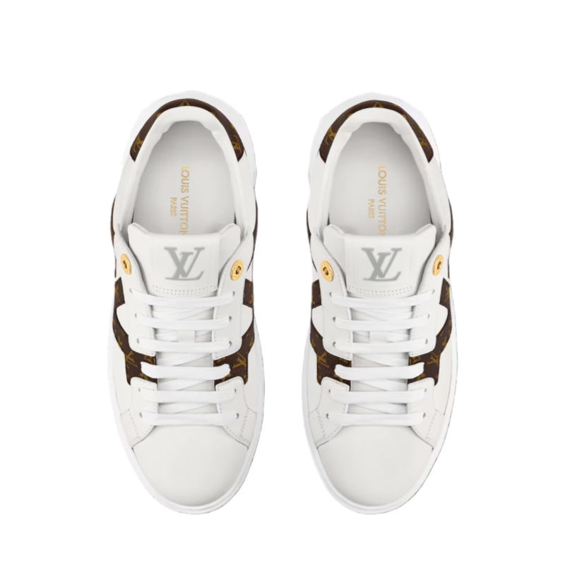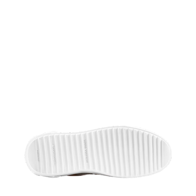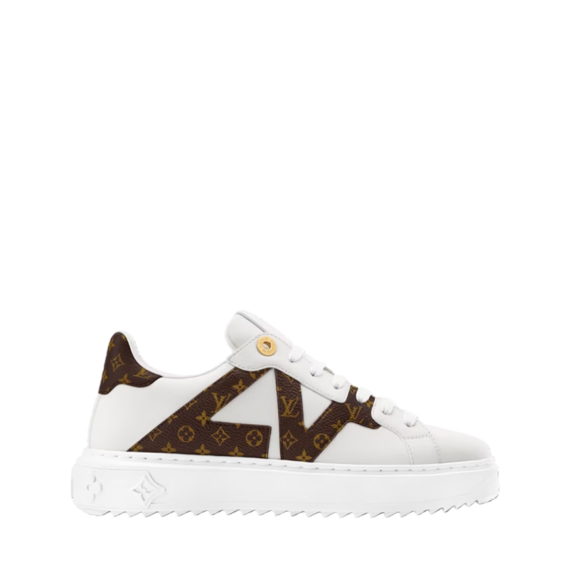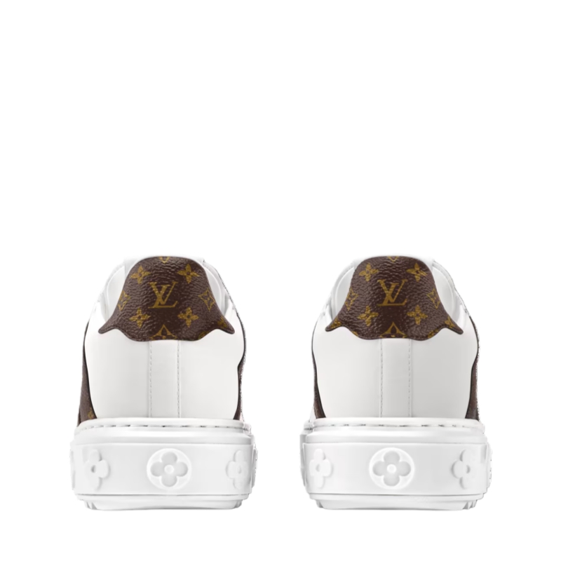 This seasonal edition of the classic Time Out sneaker comes in smooth calf leather with trim in iconic Monogram canvas, notably on the dynamic LV signature on the side. This model is characterized by its elevated outsole in lightweight EVA, which is decorated with three Monogram Flowers. The tongue is signed with an LV Initials label.