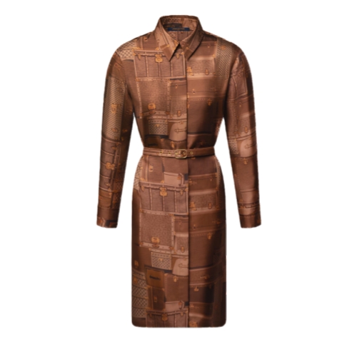 This elegant shirt dress makes an understated statement in an allover print of archival Louis Vuitton travel trunks in the House’s classic colorway. It is cut from fluid silk twill in a straight, long-sleeved silhouette complete with a smart collar and covered button tab for a clean finish. A slim coordinating belt accentuates the waistline.