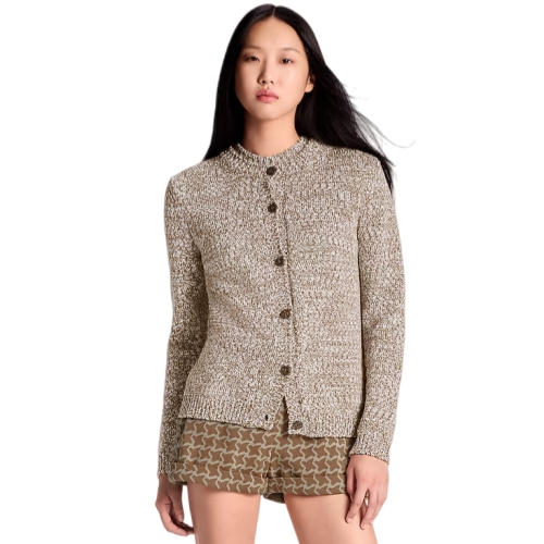 This classic crew-neck cardigan is quietly elevated in this season’s elegant tweed-inspired knit, spun from soft, cozy cotton. Monogram canvas buttons add a subtle signature to the front fastening, while the nape of the neck is detailed with an embossed leather Louis Vuitton Paris tab for a refined finishing touch.