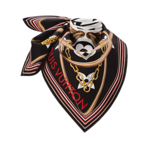 The Ultimate Monogram 90 square nods to the House's Leather Goods collection. A mix of oversized Monogram Flowers made from illustrations of straps and chains makes a striking statement against a Monogram pattern background and contrasting border. This modern take on Louis Vuitton signature motifs will delight House enthusiasts.