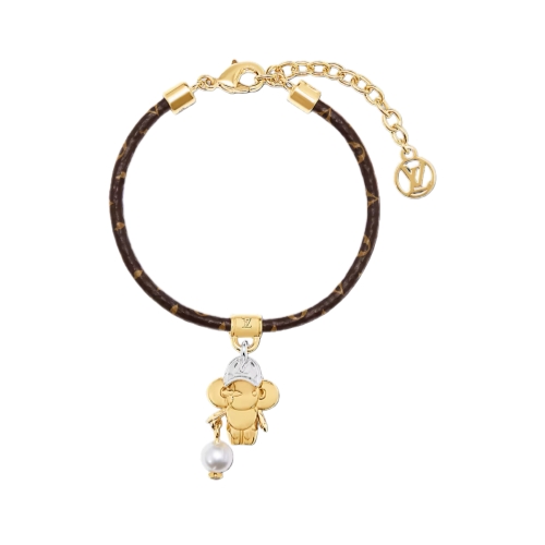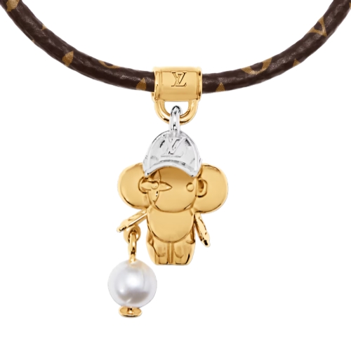 The House’s adorable Monogram-inspired mascot takes up a new sport in the Vivienne Basketball Bracelet. Dangling from a Monogram canvas cord, she is depicted in gold-tone metal wearing a white enamel LV signature cap and holding a resin pearl ball. Sure to delight Vivienne collectors, it’s a fun way to sport the Louis Vuitton signature.