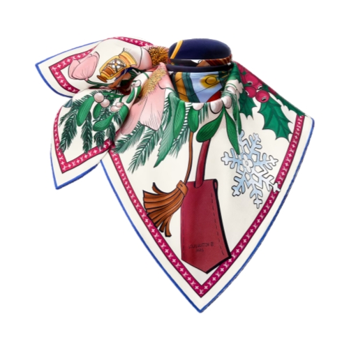 Sophisticated styling meets festive enchantment in the eye-catching design of the Vivienne Winter Celebration square. Printed on pure silk, its intricately detailed pattern depicts the House’s famous mascot enjoying holiday fun with a vibrant palette of warm wintery colors. An exceptional, charming accessory that captures the joy and celebratory spirit of the year-end season.