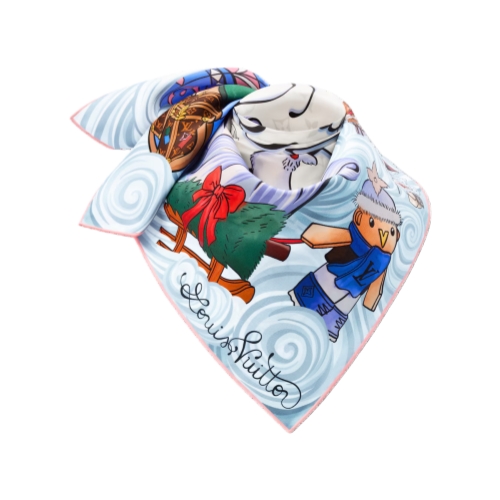 The finely detailed design of the Vivienne Winter Holiday square evokes the enchantment of snowy landscapes and the festive year-end season. Crafted in sumptuous silk, it features Vivienne and her friends enjoying winter fun: skiing, fetching a Christmas tree, riding a sleigh full of presents… A Monogram background adds a subtle House signature to this elegant, sophisticated accessory.