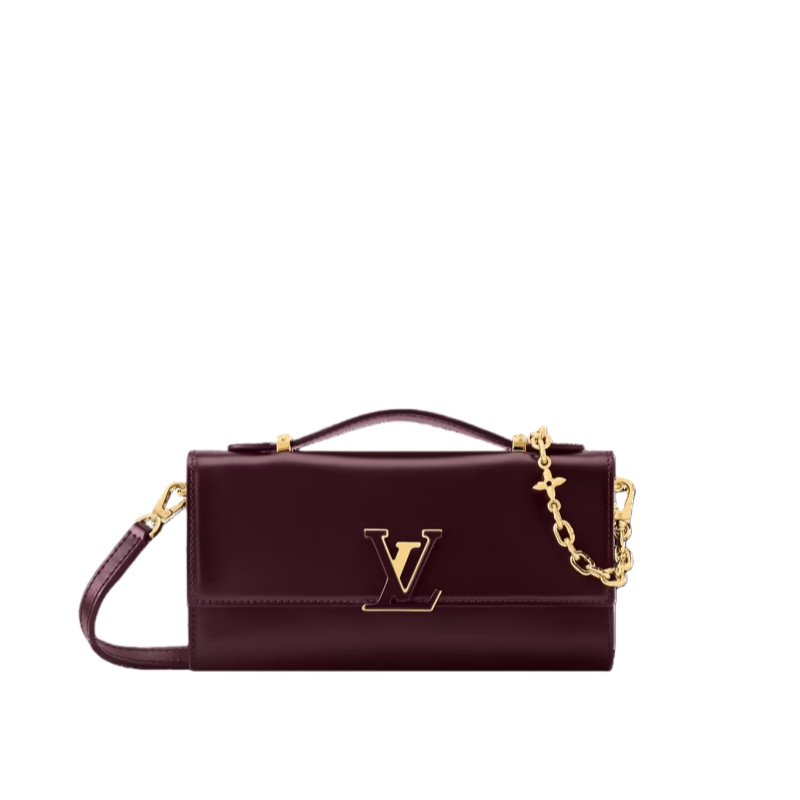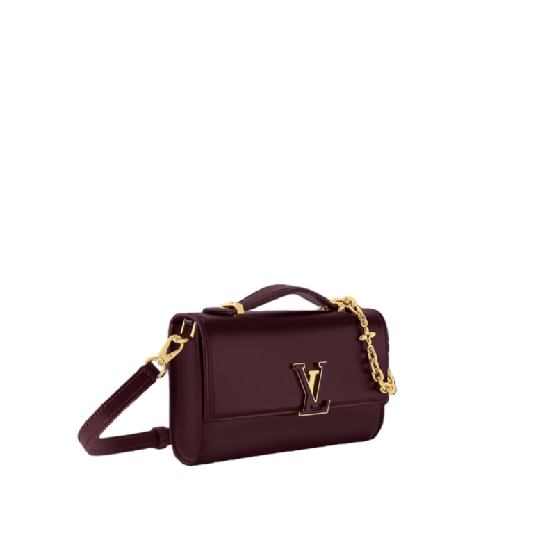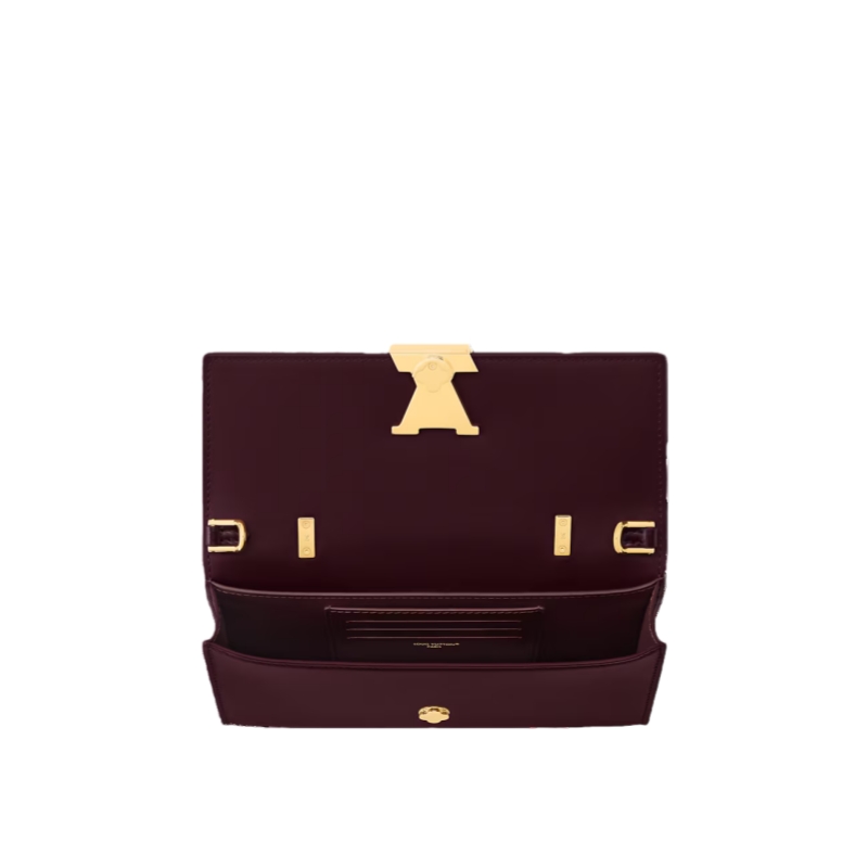 This edition of the Wallet On Chain Capucines is reimagined in a sophisticated Wine Red colorway that complements both day and night looks. Crafted from calf leather, it is adorned with gold-toned LV Initials and a removable chain. The chic design also reveals a Monogram Flower magnetic closure, adding further attention to detail.
